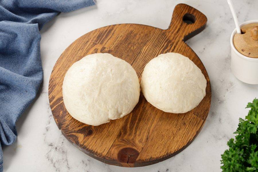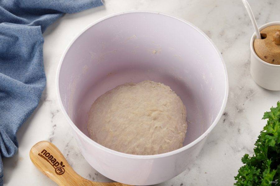 Замесите руками мягкое и чуть липкое тесто. Соберите его в шар, смажьте маслом, накройте миску с тестом полотенцем и уберите в тёплое место до увеличения в объёме в два раза.