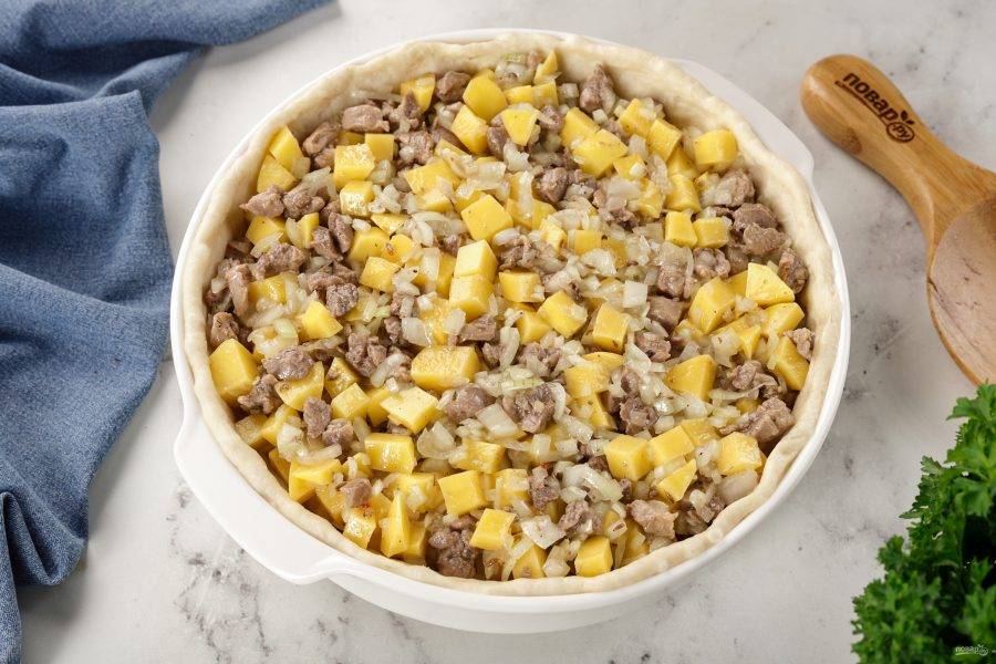 Переложите подготовленное мясо в глубокую миску. Добавьте нарезанный кубиками картофель. Я предварительно бланширую картофель, погружая его в кипяток на 5-7 минут, а затем опускаю в ледяную и откидываю на сито или дуршлаг. Бланшировать картофель для пирога не обязательно, это зависит от его сорта и величины ломтиков.