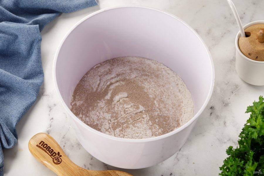 В глубокой миске соедините муку, сахар, соль и дрожжи.