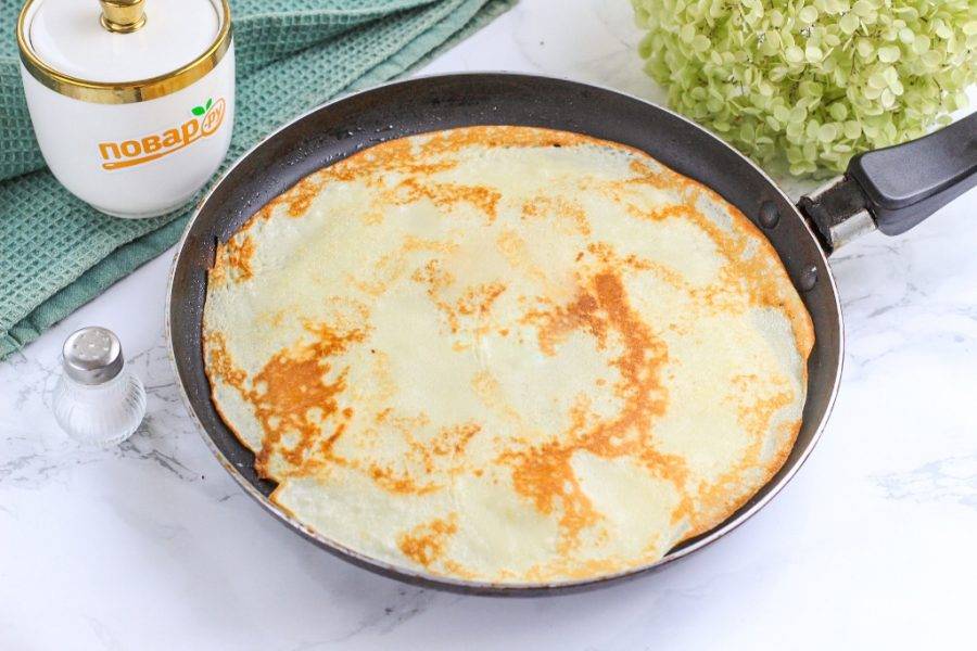 Раскалите блинную сковороду и смажьте ее маслом в первый раз. Влейте половину половника теста и округлите. Испеките блин по 1-2 минуте с каждой стороны и выложите на тарелку. Таким образом испеките и остальные блины.