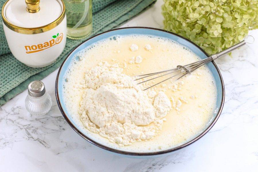 Аккуратно по частям всыпьте пшеничную муку и не взбивайте, а вмешайте ее в массу, чтобы не образовались комочки.