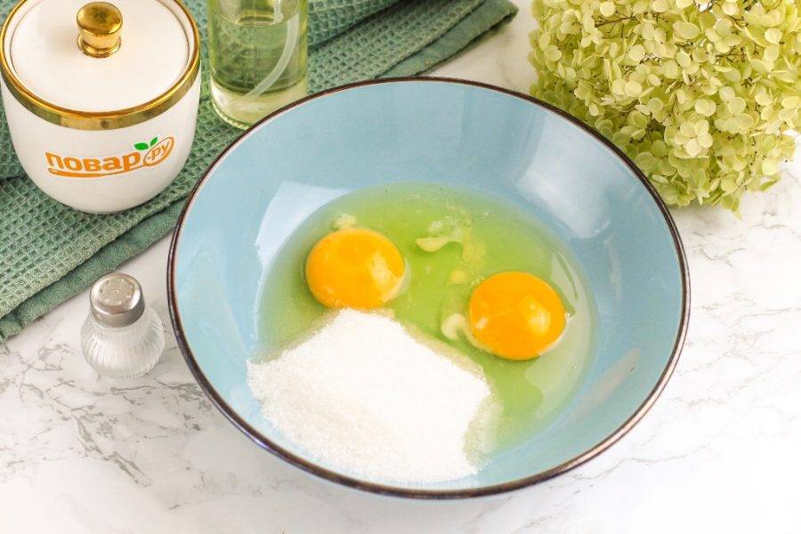 Вбейте куриные яйца в глубокую емкость или салатник, всыпьте сахарный песок и соль. Взбейте венчиком примерно 1-2 минуты. В пышную пену массу взбивать не нужно, главное — тщательно перемешать желтки и белки.