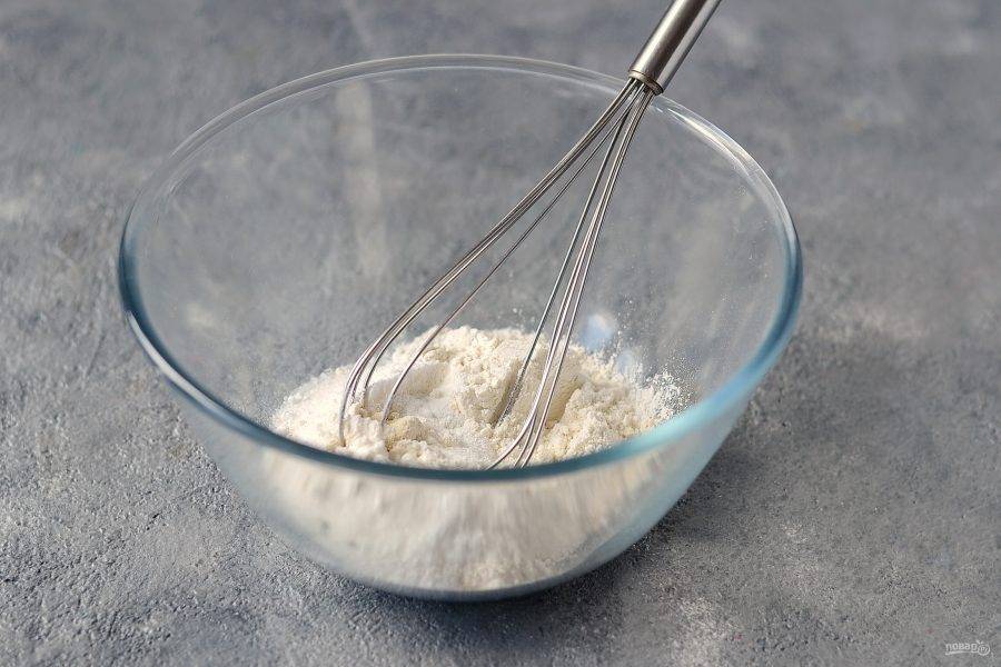 Смешайте муку, протеин, разрыхлитель, сахар и щепотку соли в большой миске.