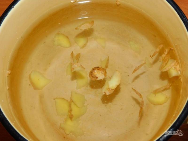 Имбирь нарежьте небольшими кусочками, залейте водой и доведите до кипения.