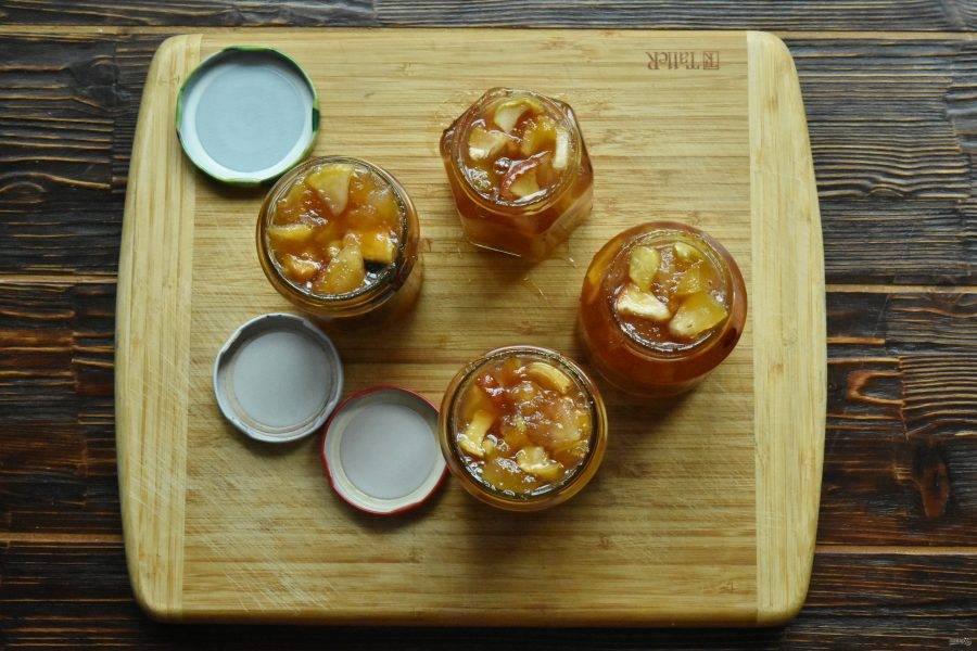 Таким образом варите и остужайте варенье в 3-5 заходов, пока оно не приобретет желаемую консистенцию. При остывании яблоки пропитываются сиропом и варенье густеет.