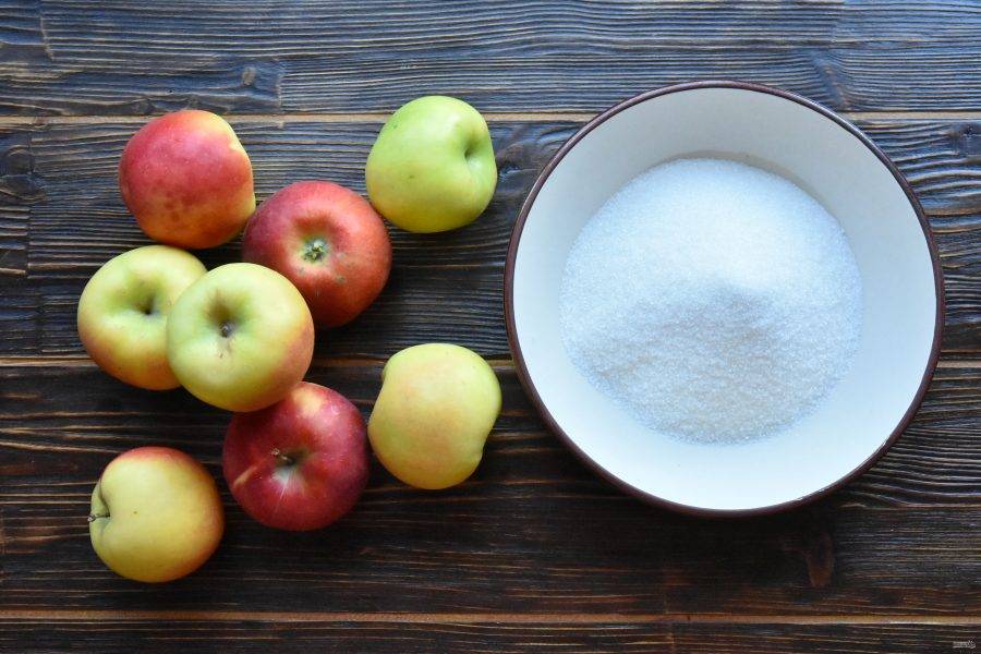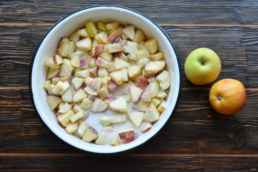 Выложите нарезанные яблоки в подходящую посуду и взвесьте. На 1 кг. готового продукта всыпьте 600 грамм сахарного песка. Встряхните миску, чтобы сахар равномерно распределился и покрыл кусочки яблок.