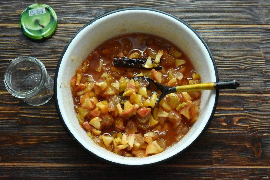 Удалите палочку корицы. Горячее варенье разложите в подготовленные банки и закрутите крышками. Переверните вверх дном и оставьте до полного остывания.
