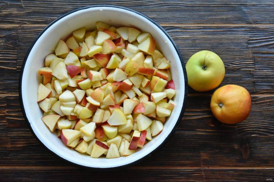 Разрежьте яблоки на четвертинки, извлеките сердцевину с косточками и нарежьте на кусочки. Это могут быть кубики или дольки, на ваше усмотрение.