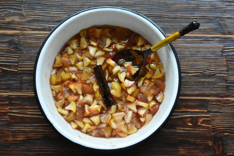 Оставьте миску с заготовкой на 6-8 часов, до выделения сока. Поставьте посуду на огонь, выше среднего и доведите до кипения. Добавьте в сироп палочку корицы. Кипятите варенье 3-5 минут. После чего снимите с огня и дайте ему полностью остыть.