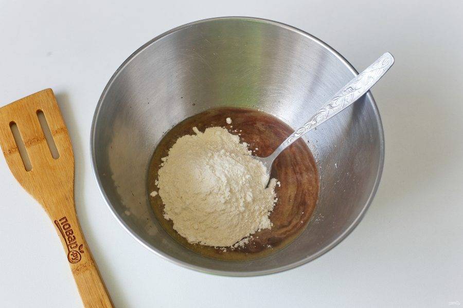 Перемешайте и частями добавьте муку.