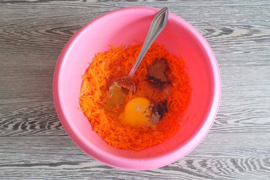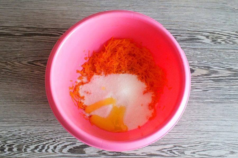 В чашу натрите морковь. Добавьте сахар и мёд. Перемешайте.