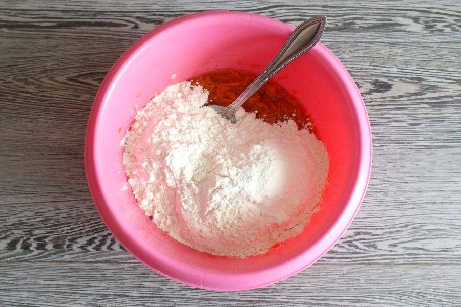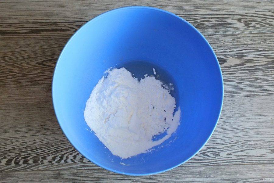 Всыпьте муку, разрыхлитель. Начните замешивать тесто с помощью ложки. Как только оно начнет собираться в комок, месите руками.