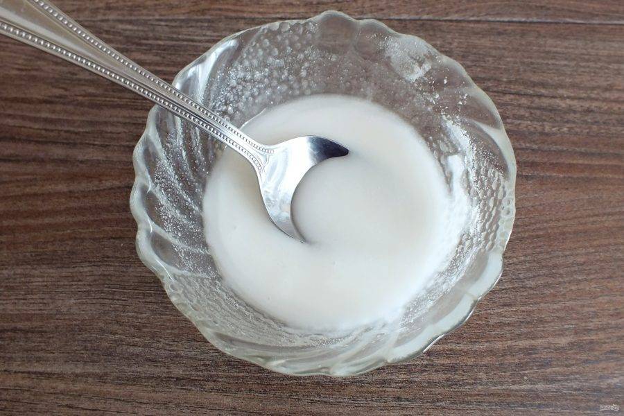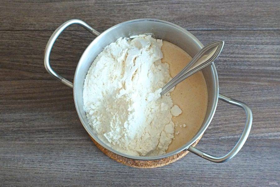 Вмешайте муку в массу с помощью ложки. Получится густое, вязкое тесто.