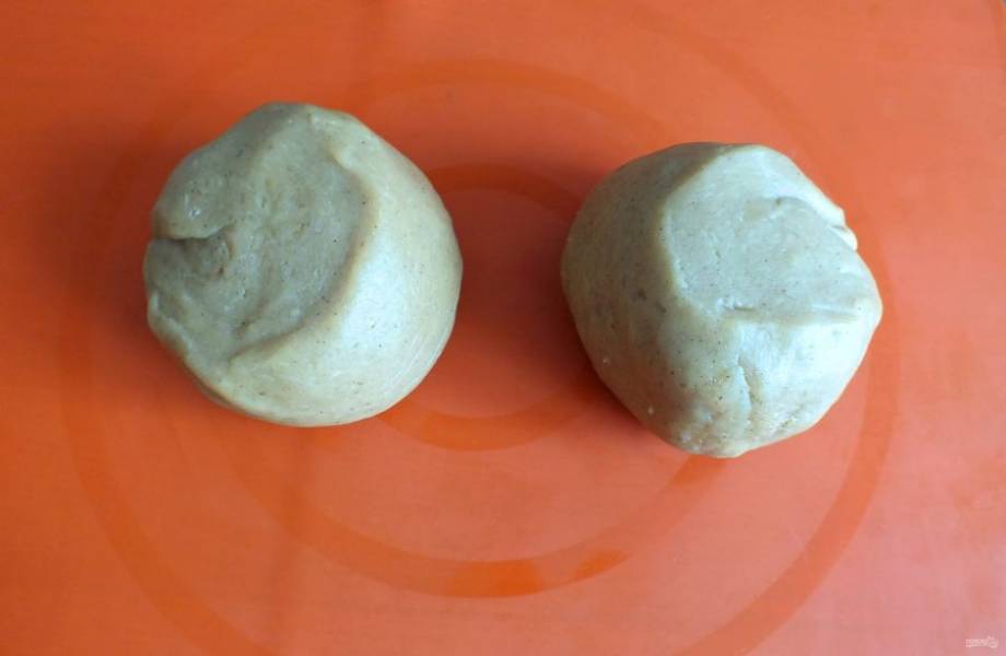 По истечении времени достаньте тесто из холодильника. Поделите его на две равные части.