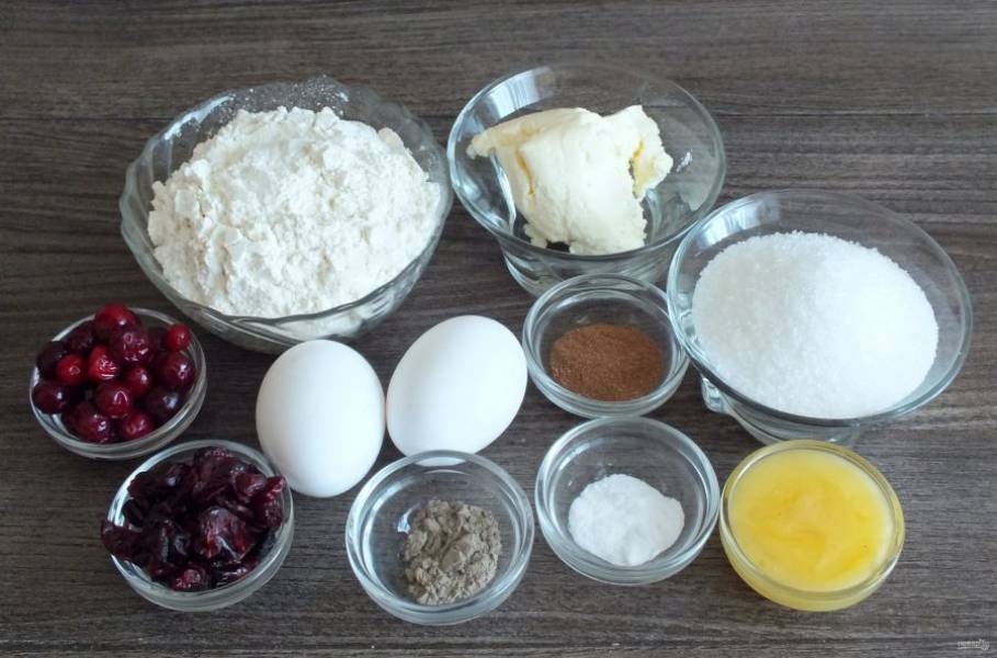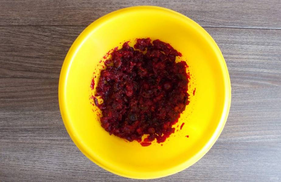 Перед тем как достать тесто из холодильника, сделайте начинку. Соедините в чаше клюкву, сахар и вяленую клюкву. Пробейте погружным блендером. Масса не должна быть жидкой. Если есть лишний сок, его необходимо сцедить.