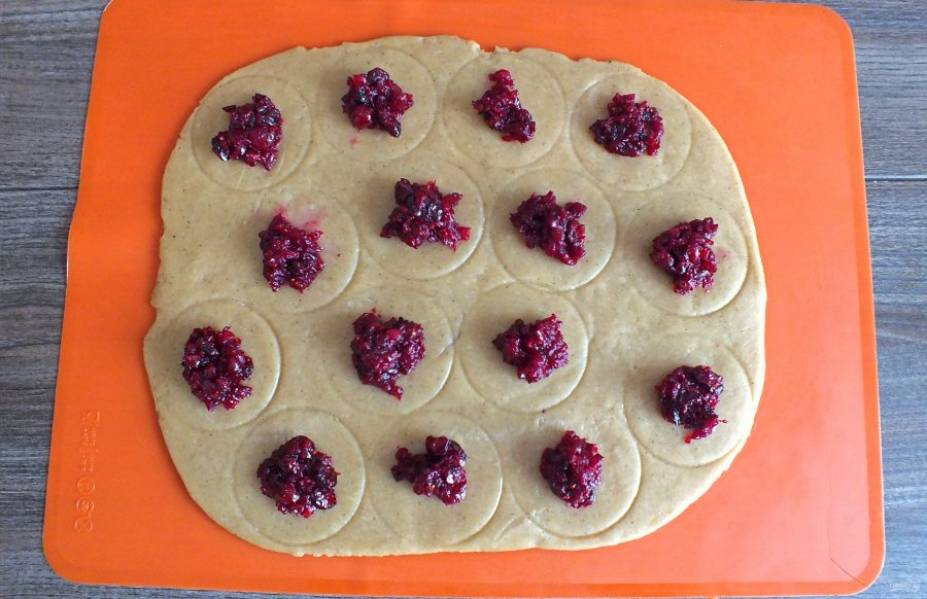 На одной из частей сделайте стаканом насечки. Разложите в центр насечек по 1 ч.л. начинки.