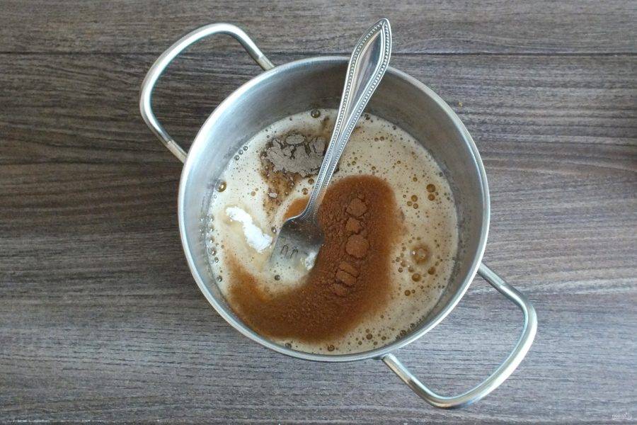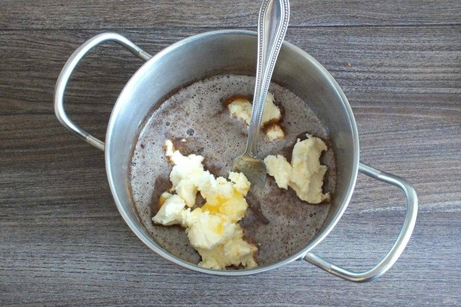 Добавьте мягкое сливочное масло и поставьте на медленный огонь. Нагревайте, помешивая, до растворения продуктов. Не доводите до кипения.