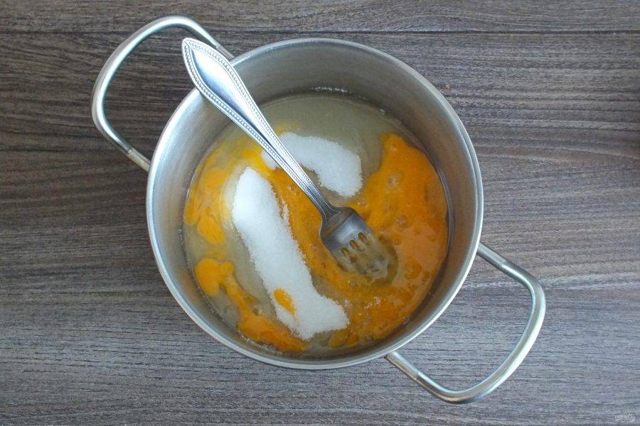 Возьмите толстостенную кастрюлю. Разбейте в неё яйца, добавьте сахар. Перемешайте.