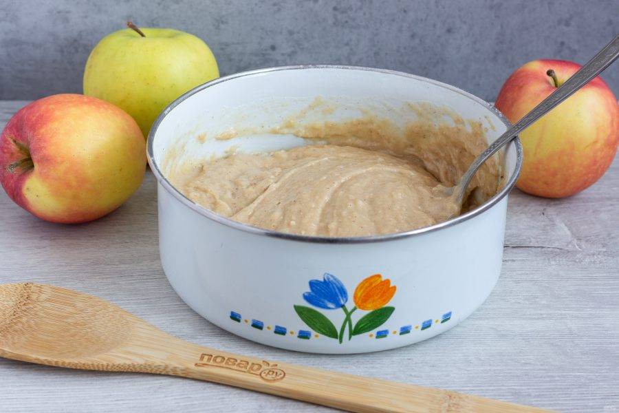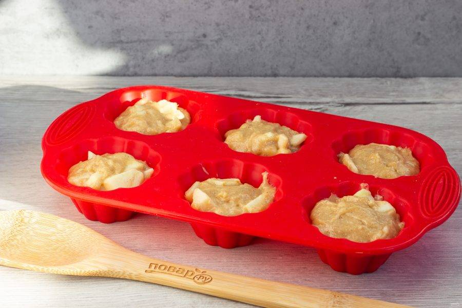 Добавьте яблоки в тесто, перемешайте. Разложите тесто в порционные формы. Силиконовые я ничем не смазываю, металлические можно смазать растительным маслом.