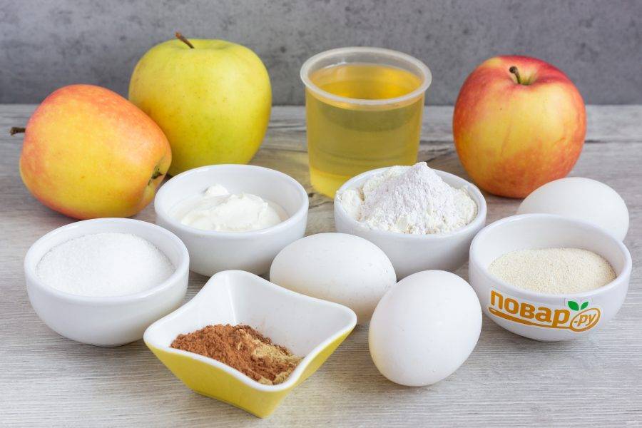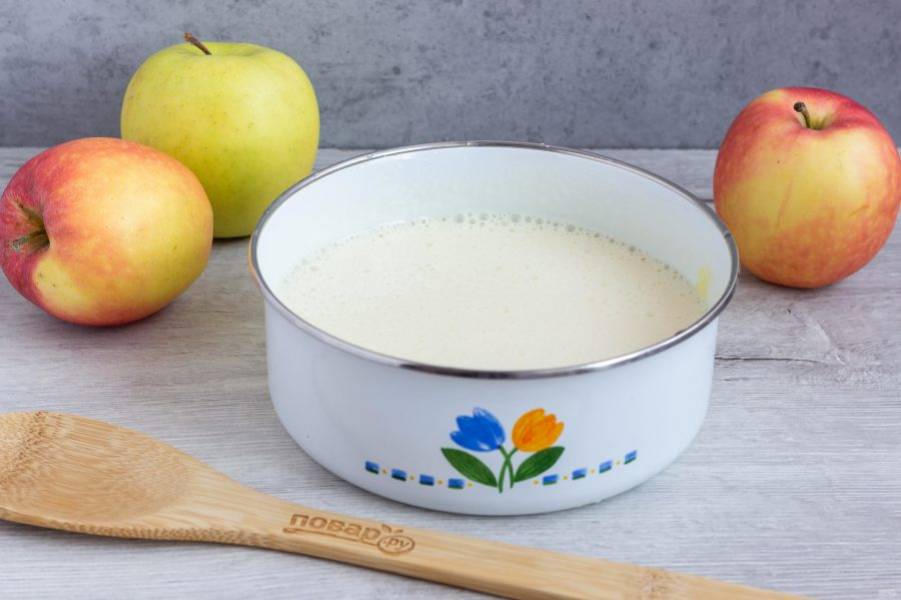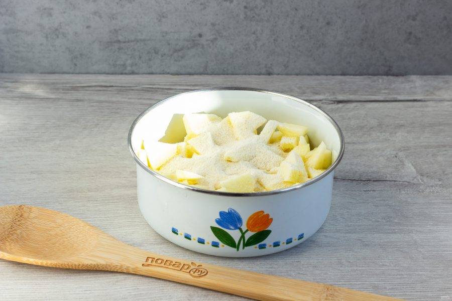 Яблоки помойте, очистите от сердцевины и кожуры. Нарежьте небольшими кусочками и перемешайте с манкой.