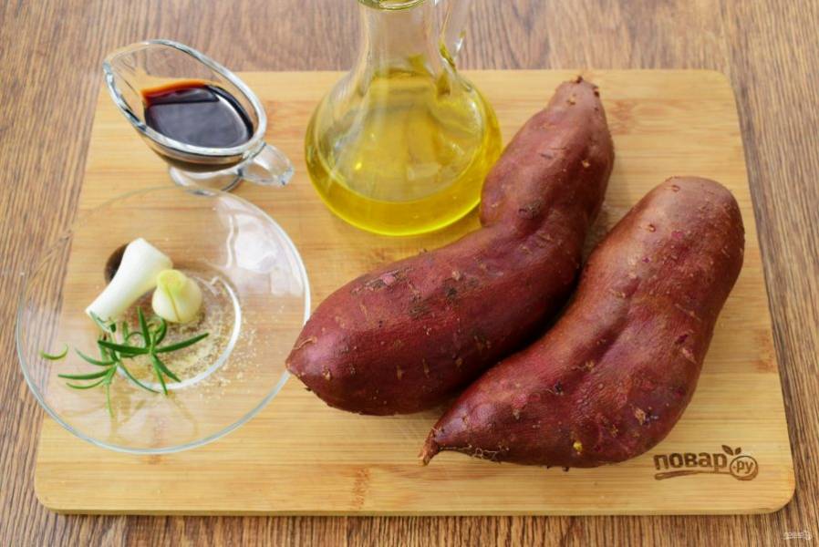 Духовку включите на 230 °С. Батат тщательно вымойте.