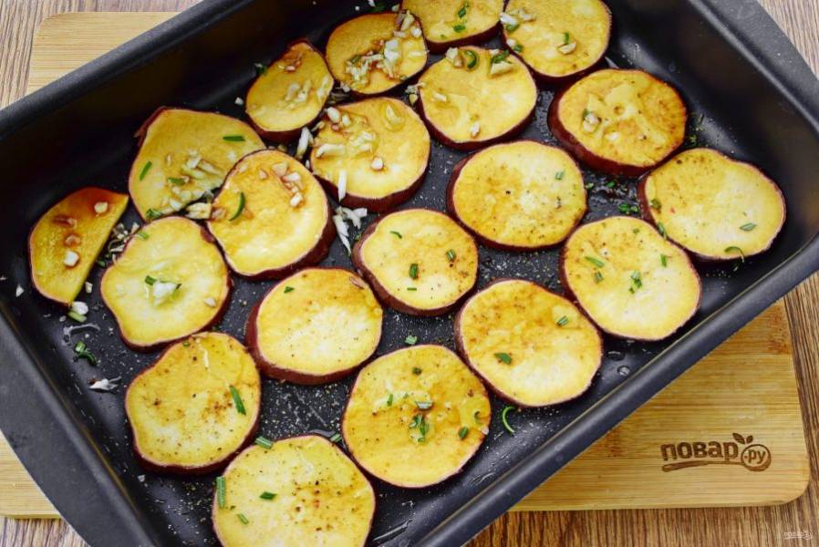 Нарежьте его тонкими ломтиками, разложите на противне для запекания в один слой. Полейте оливковым маслом и соевым соусом, посыпьте мелко рубленным чесноком и розмарином, поперчите по вкусу.