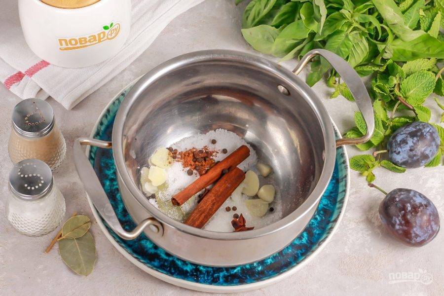 Всыпьте сахар и соль в кастрюлю или ковш. Добавьте туда же молотую корицу и палочки корицы, гвоздику, лавровые листья, горошины черного перца. Очистите и промойте чесночные зубчики, нарежьте их слайсами в кастрюлю.