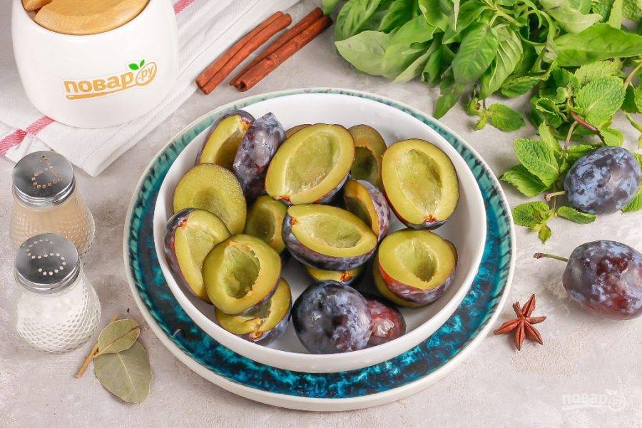 Сливы промойте в воде и располовиньте, удалите косточки. Срежьте подпорченные места, если такие имеются на фруктах.