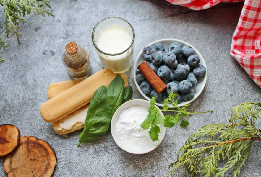 Подготовьте все необходимые ингредиенты для приготовления пряного крема из голубики. Ягоды переберите, вымойте и обсушите.