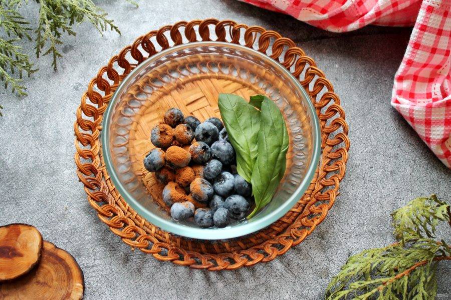 В глубокую миску выложите ягоды, добавьте листья базилика, щепотку свежемолотого черного перца и корицу.