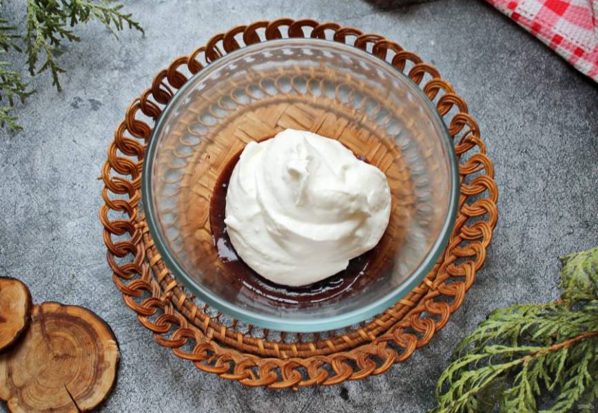 В сливки добавьте сахарную пудру и взбейте в пышную массу. Соедините взбитые сливки с пряным ягодным пюре и аккуратно перемешайте. Выложите крем в креманку и подавайте с савоярди, украсив веточкой мяты и ягодами.