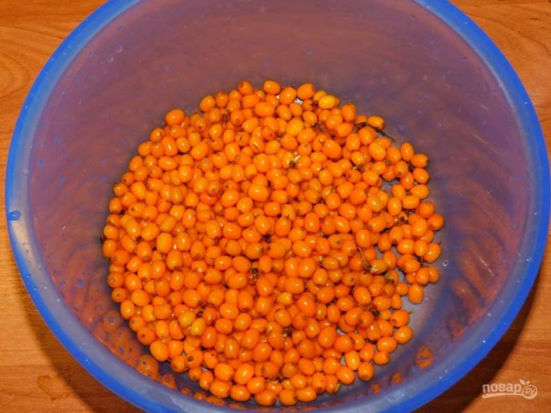 Наберите необходимое количество ягод облепихи. Промойте их.