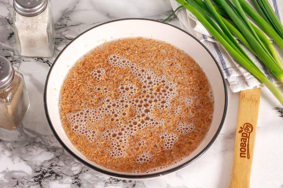 Высыпьте пшеничную крупу в глубокую емкость и влейте воду. Промойте несколько раз, удаляя шелуху.