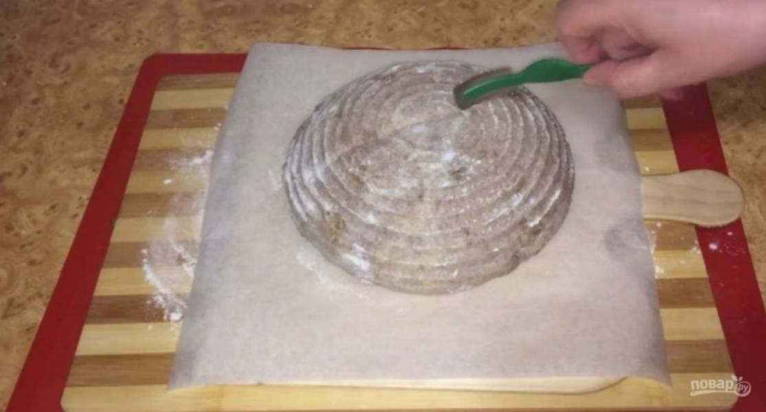Присыпьте тесто мукой и оставьте на 2-3 часа. Придерживая тесто рукой, переверните корзинку и выложите на пергамент. Аккуратно смахните кисточкой муку, сделайте несколько надрезов и сбрызните водой.