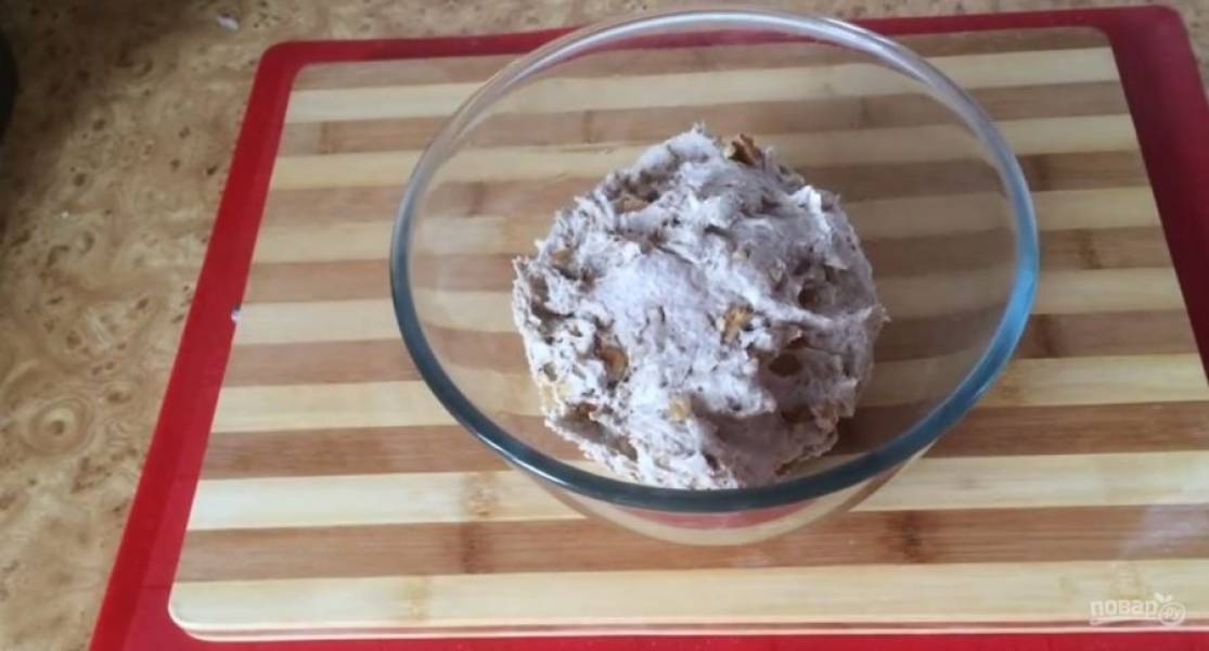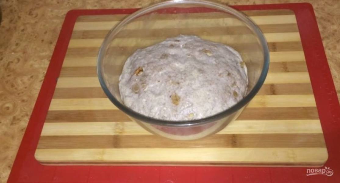 Добавьте грецкие орехи и изюм. Месите до однородности теста. Переложите в миску, смазанную растительным маслом и слегка обомните. Влажными руками выровняйте верх теста и накройте пищевой пленкой.