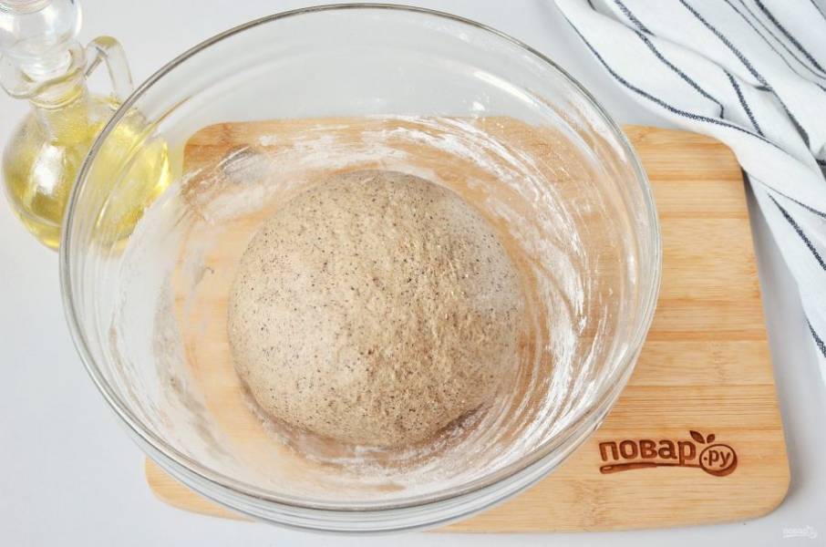 Когда мука хорошо увлажнится, перекладывайте тесто на рабочий стол и месите руками, пока не образуется упругий колобок. Верните его в миску, накройте плотно пленкой и уберите в тепло на 1,5 часа.