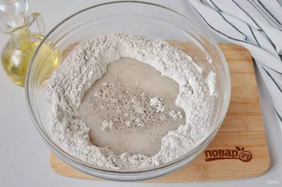 Сделайте в центре углубление, влейте дрожжевую смесь.