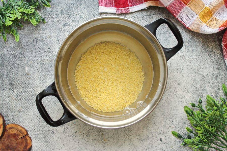 При необходимости пшено переберите, промойте и замочите в горячей воде на 10–15 минут. Слейте воду и промойте в теплой воде, пока крупа не станет прозрачной. Откиньте пшено на сито и дайте воде полностью стечь.