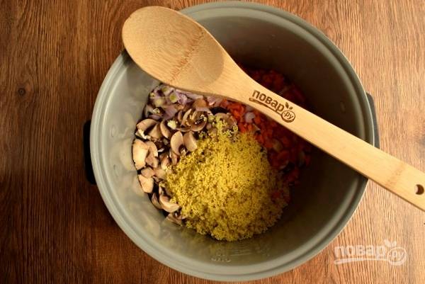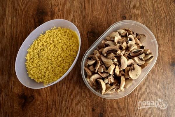 Пшено промойте, залейте горячей водой, слейте и еще раз промойте. Грибы нарежьте тонкими пластинками.