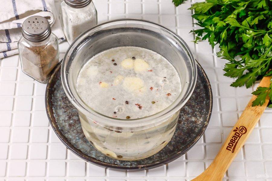 В глубокую стеклянную емкость всыпьте соль и горошины черного перца. Соль обязательно должна быть крупного помола, не йодированная.