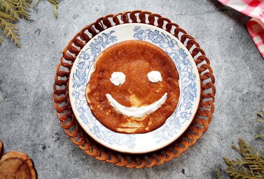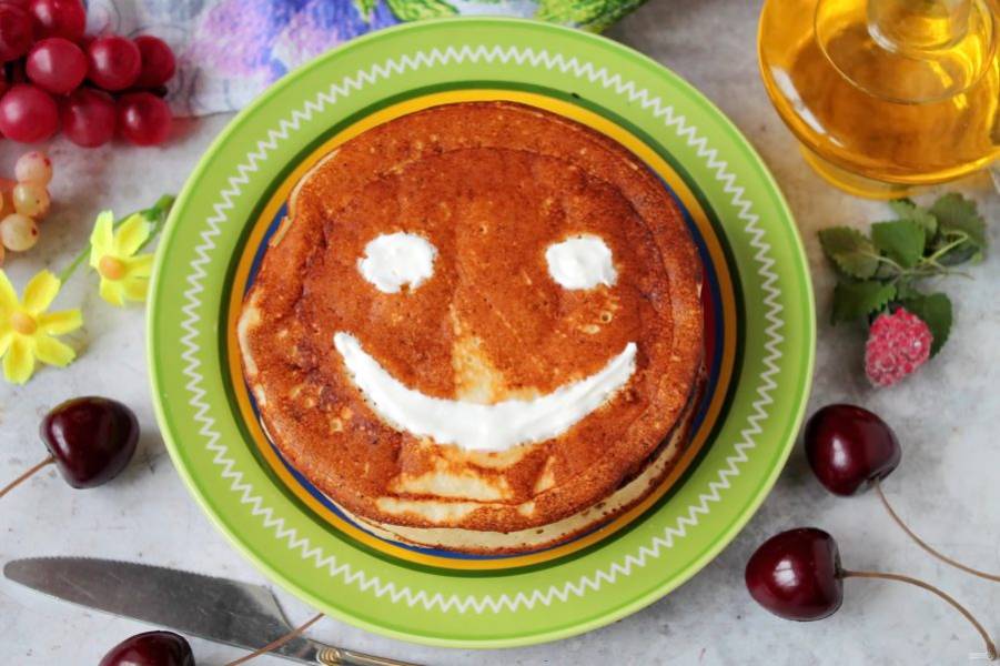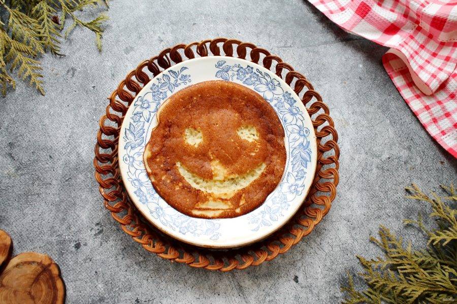 Смешайте сметану с сахарной пудрой и заполните отверстия глаз и улыбки. Готовые пузи-блинчики сразу подавайте и радуйте детей.