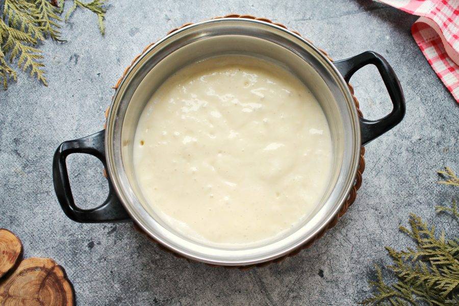 Соедините обе части в однородное тесто без комочков. Влейте растительное масло и снова перемешайте.