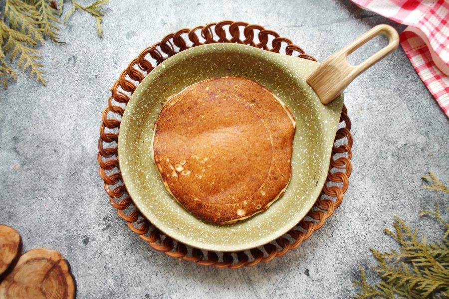 Разогрейте сковороду с тефлоновым покрытием на среднем огне и налейте половину половника теста. Выпекайте пузи-блинчики до румяной корочки, примерно 1-2 минуты. Переверните блин и жарьте еще 30 секунд, снимите его на тарелку.