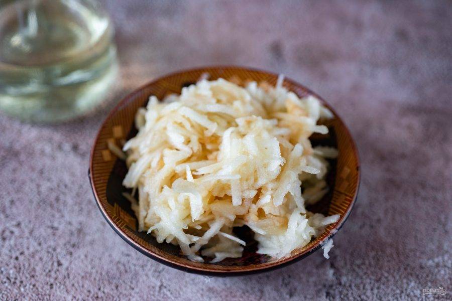 С яблок снимите кожицу и натрите яблочную мякоть на крупную терку.