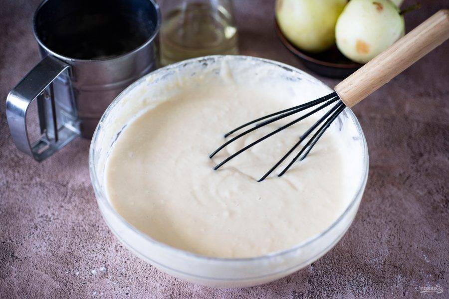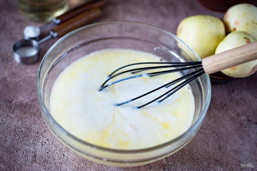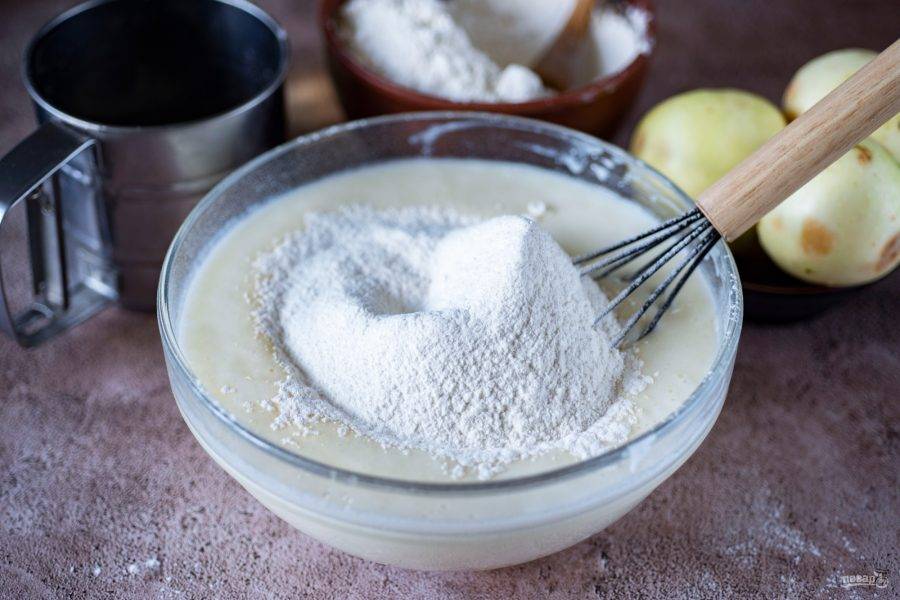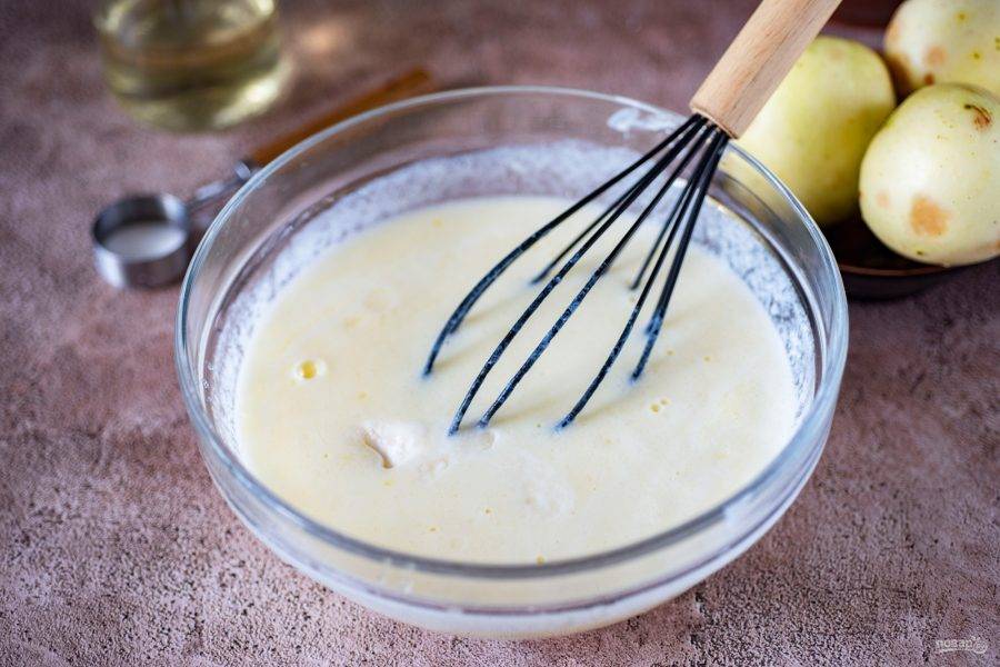 Добавьте тертые яблоки в оладьевое тесто. Перемешайте.