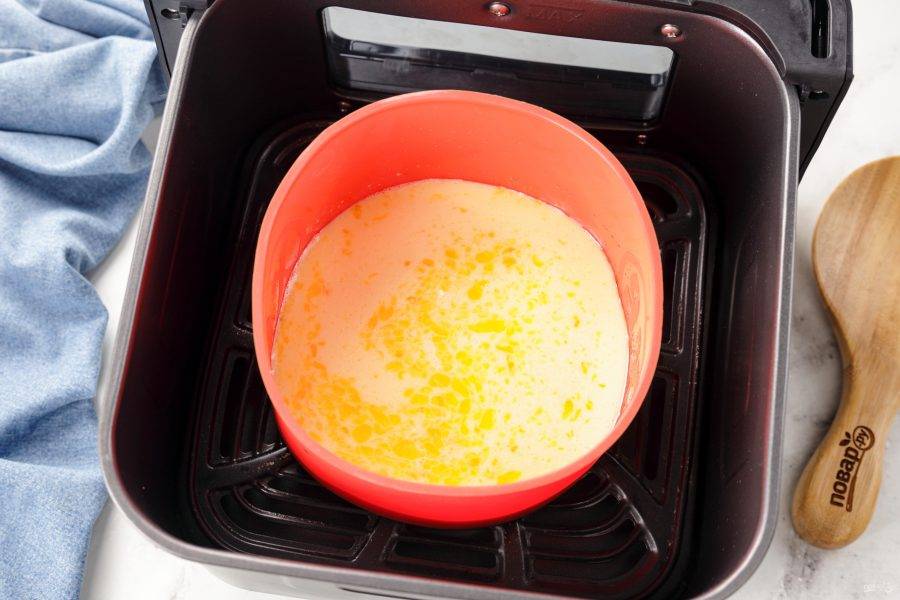 Форму смажьте растительным маслом. Вылейте в неё омлетную смесь. Чем меньше диаметр формы, тем выше будет омлет. Если в вашем аэрогриле верхний вентилятор, то выбирайте такую форму, чтобы омлетная смесь не доходила до краев около 2 см. Иначе смесь расплескается.