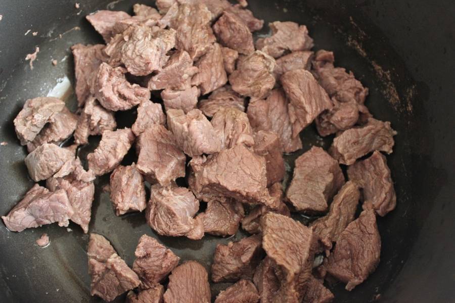 В чашу мультиварки вливаю растительное масло, включаю режим жарка и кидаю кусочки говядины. Жарю, помешивая, 7-10 минут. За это время может появиться пена, которая обычно выделяется при жарке. Ее лучше собрать ложкой, или просто промыть мясо водой после окончания режима жарки.