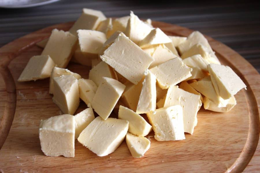 Плавленный сыр нарезаю небольшими кусочками. Если вы будете использовать мягкий плавленный сыр (для завтраков), то резать его, разумеется, не нужно.