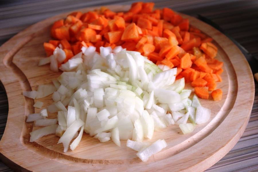 Мелко режу репчатый лук. Морковь нарезаю дольками.