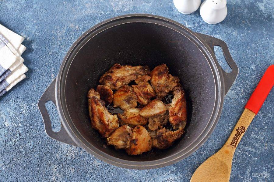 Курицу нарежьте порционными кусочками и обжарьте на сильном огне со всех сторон до появления румяной корочки с добавлением соли и специй.